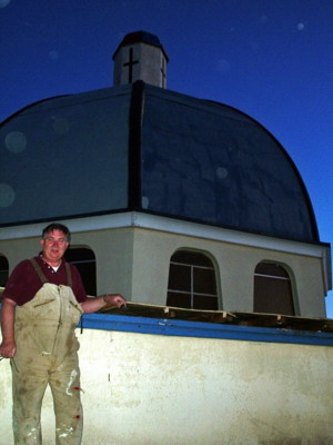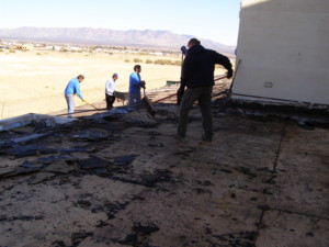 Bod has joined in the effort of removing the built-up roof from the lobby section of the church/tabernacle.